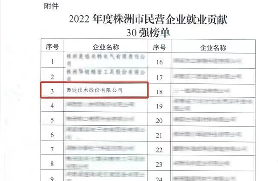 2023年3月10日,株洲市人力資源和社會保障工作會議在市人力資源和社會保障局召開。會議為“2022年度主軸市民營企業(yè)就業(yè)貢獻30強”進行了授牌頒獎,本次表彰共授予株洲市30家企業(yè)“就業(yè)貢獻獎”稱號,西迪技術(shù)股份有限公司榮獲“2022年度株洲市民營企業(yè)就業(yè)貢獻獎”稱號。