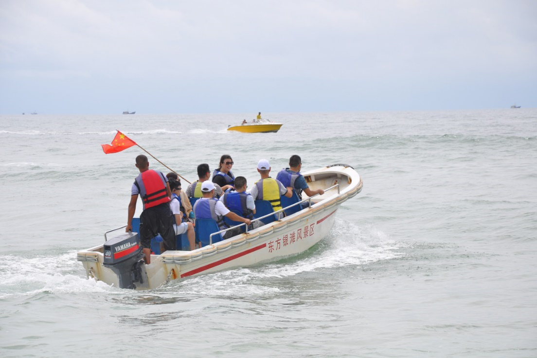 我們的女同事都披上了夏威夷風格的海灘披巾,怕被炙熱的太陽曬傷,墨鏡、大遮沿太陽帽、太陽傘等裝備齊全。盡管毒辣的太陽也無法阻擋我們對大海的熱愛,趕緊脫掉鞋子去海水里走走,一起與大海拍照留念。