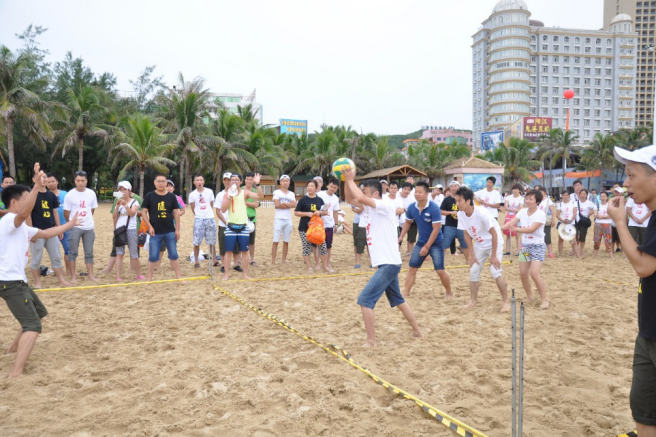 我們在黃金海岸舉行了沙灘排球、拔河、兩人雙足等眾多有利于團建的沙灘娛樂活動??纯次覀兊纳碁┡徘蛘l更厲害,首先姿勢要擺對,聽我口哨準備發球啦!啦啦隊們為我們的精彩比賽喝彩!